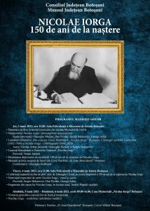 În perioada 3 iunie – 6 iunie 2021, Muzeul Judeţean Botoşani organizează manifestările prilejuite de împlinirea a 150 de ani de la naşterea lui Nicolae Iorga, după următorul program: