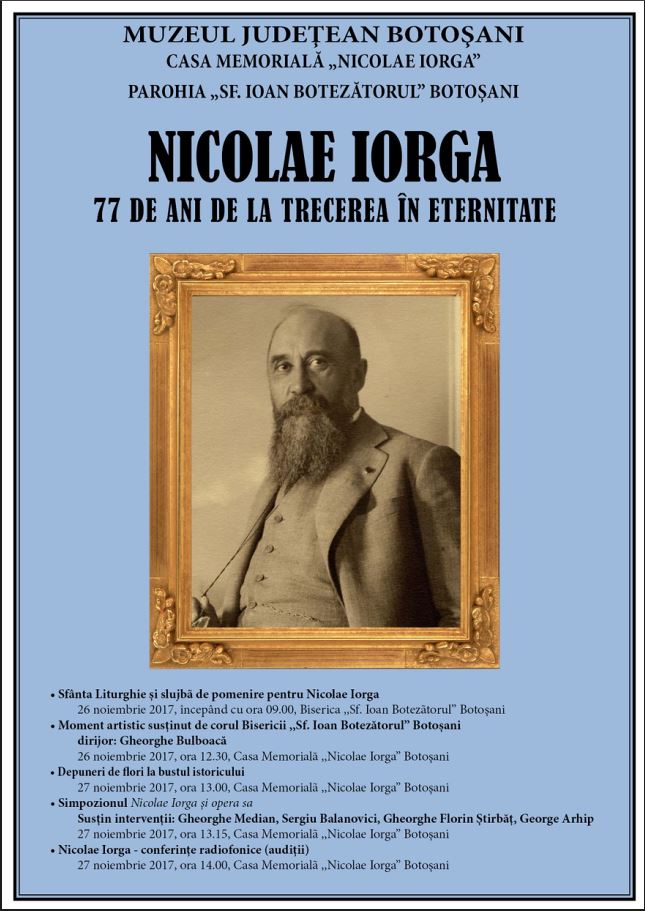 Muzeul Judeţean Botoşani organizează, în zilele de 26 şi 27 noiembrie 2017, comemorarea a 77 de ani de la trecerea în eternitate a lui Nicolae Iorga.
