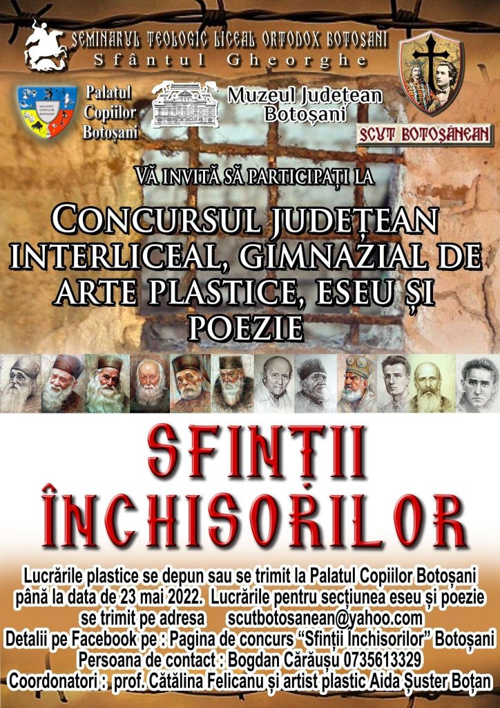 Asociația „Scut botoșănean”, Seminarul Teologic Liceal Ortodox Sfântul Gheorghe și Palatul Copiilor Botoșani, în colaborare cu Muzeul Judeţean Botoşani şi Inspectoratul Școlar Județean Botoșani, organizează concursurile cu tema „Sfinții Închisorilor”, ediția 2022.