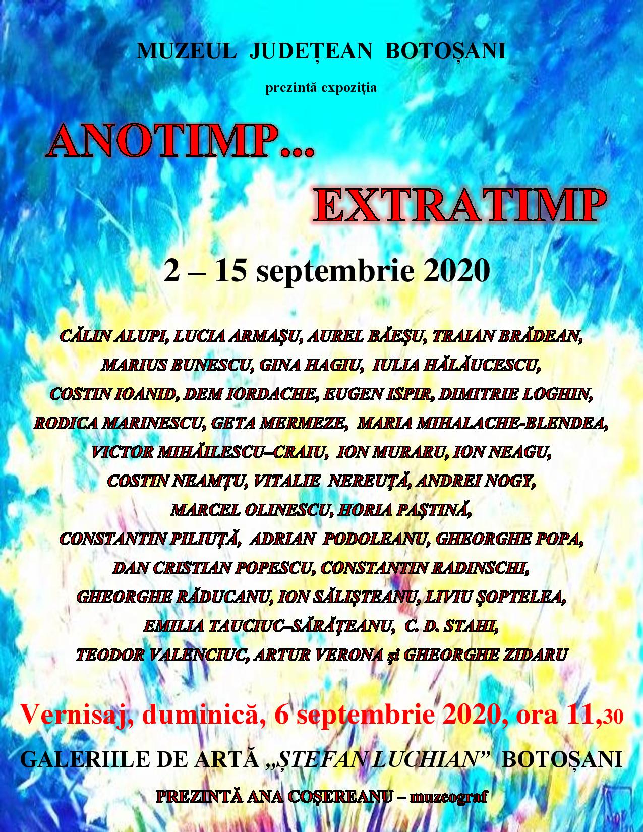 Muzeul Judeţean Botoşani – Secția de Artă Plastică și Etnografie vă invită, în perioada 2 – 15 septembrie 2020, să vizitați expoziția ANOTIMP… EXTRATIMP, deschisă la Galeriile de Artă ,,Ștefan Luchianˮ Botoșani.