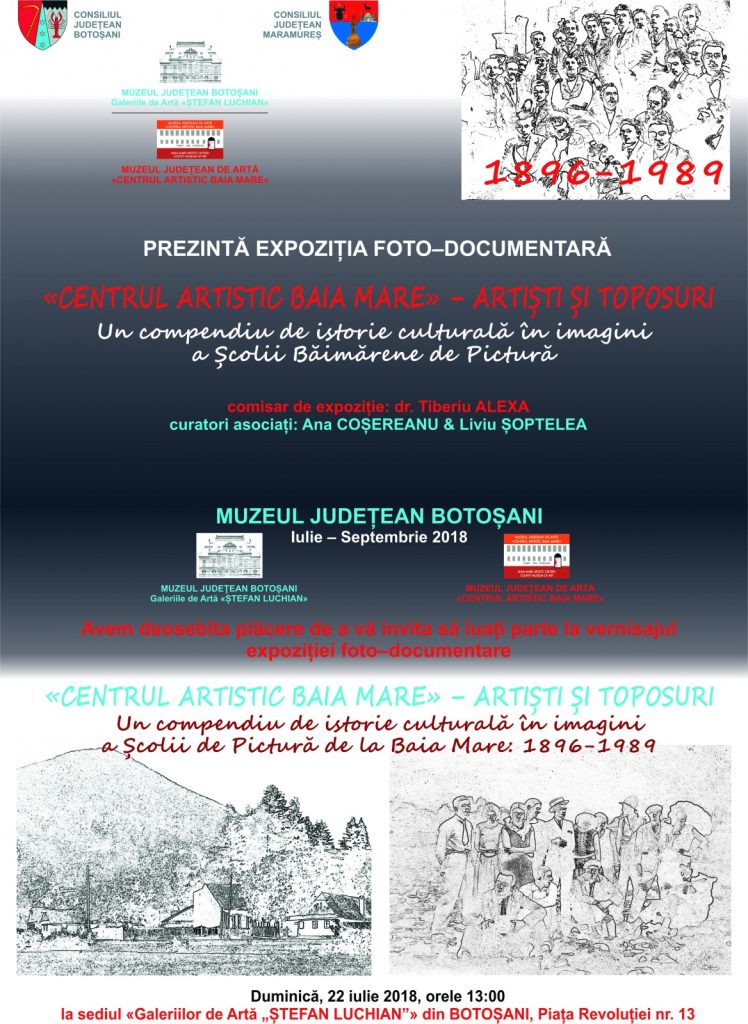 Muzeul Judeţean Botoşani vă invită în perioada 22 – 4 august 2018, în spaţiul Galeriilor de Artă ,,Ştefan Luchian” Botoşani, să vizitați expoziția foto-documentară ,,CENTRUL ARTISTIC BAIA MARE” – ARTIȘTI ȘI TOPOSURI, organizată de Muzeul Județean de Artă ,,Centrul Artistic Baia-Mare”.