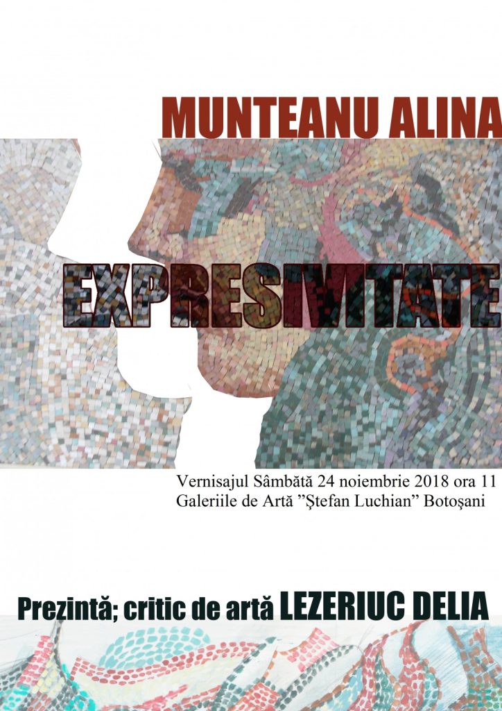 Muzeul Judeţean Botoşani vă invită în perioada 24 noiembrie – 6 decembrie 2018, în spaţiul Galeriilor de Artă ,,Ştefan Luchian” Botoşani, să vizitați expoziția personală ,,EXPRESIVITATE” (pictură), cu lucrări semnate de artistul plastic Alina Munteanu.