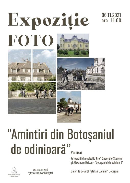 Din 6 noiembrie 2021, de la ora 11.00, Galeriile de Artă „Ștefan Luchian” vor găzdui expoziția fotografică intitulată „Amintiri din Botoșaniul de odinioară”. Reconstituind diverse momente ale trecutului orașului prin lentila aparatului de fotografiat, vernisajul va pune în valoare fotografii din colecția prof. Gheorghe Stanciu și Alexandru Hriscu, „Botoșaniul de odinioară”. Vă așteptăm!