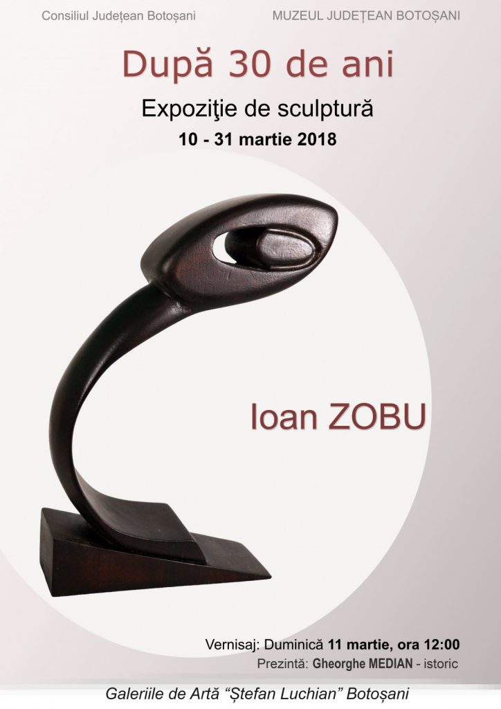Muzeul Judeţean Botoşani găzduieşte în perioada 11 – 31 martie 2018, în spaţiul Galeriilor de Artă ,,Ştefan Luchian” Botoşani, expoziţia personală de sculptură în lemn ,,După 30 de ani”, cu lucrări semnate de Ioan ZOBU.