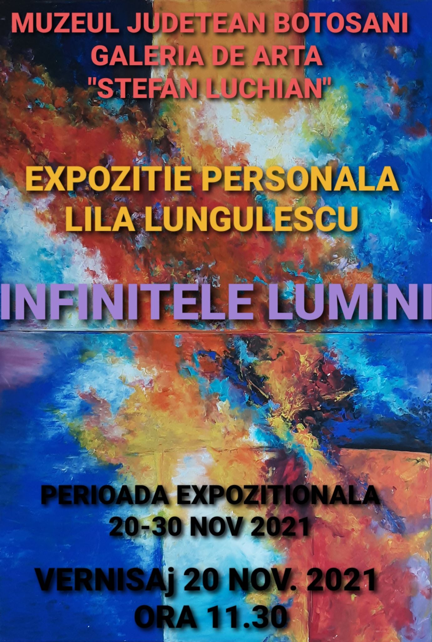 Muzeul Judeţean Botoşani vă invită, în perioada 20-29 noiembrie 2021, la Galeriile de Artă ,,Ștefan Luchianˮ Botoșani, să vizitați expoziția personală „Infinitele lumini”, a artistei Lila Lungulescu.