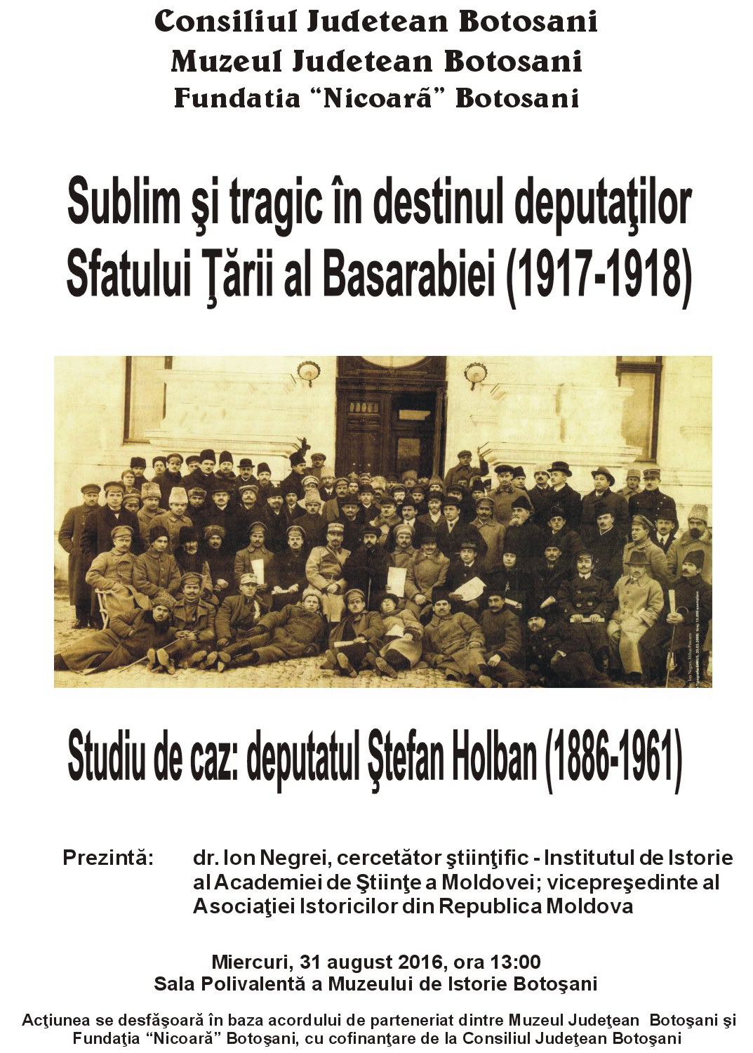 Muzeul Județean Botoșani găzduiește miercuri, 31 august 2016, ora 13:00, în Sala Polivalentă a Muzeului de Istorie Botoșani, conferința „Sublim și tragic în destinul deputaților Sfatului Țării al Basarabiei (1917-1918). Studiu de caz: Deputatul Ștefan Holban (1886-1961)”.