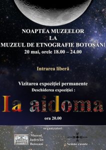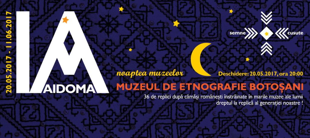 Muzeul Judeţean Botoşani, Secţia de Artă plastică – Etnografie , în colaborare cu asociaţia „Semne cusute”, îi invită pe toţi iubitorii de frumos să viziteze expoziţia „Ia aidoma”, la Muzeul de Etnografie Botoşani, în perioada 20 mai – 11 iunie 2017. Deschiderea acesteia va avea loc sâmbătă, 20 mai 2017, orele 20.00, în cadrul programului Noaptea Muzeelor.