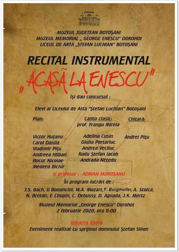 în Sala Polivalentă a Muzeului Memorial „George Enescu” Dorohoi, recitalul instrumental „Acasă la Enescu”.