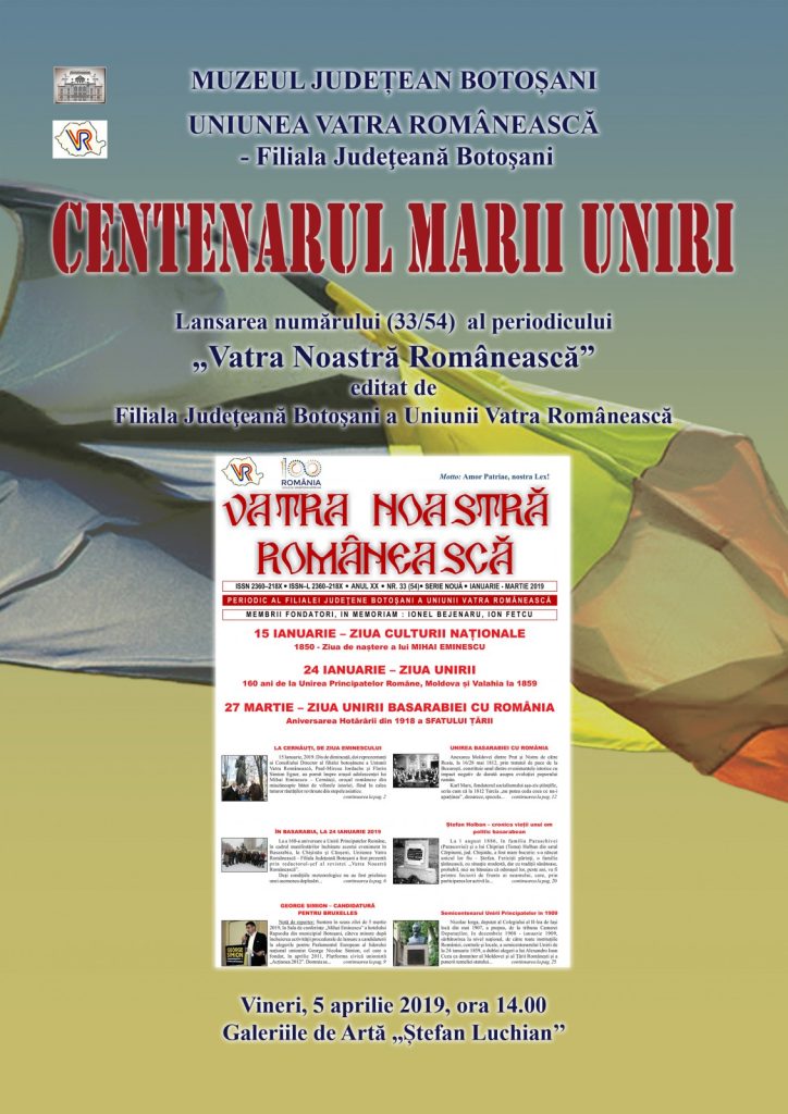 Muzeul Județean Botoșani și Uniunea „Vatra Românească” – Filiala Botoșani organizează lansarea numărului 33/54 al periodicului „Vatra Noastră Românească”. Prezintă Paul – Mircea Iordache, Dan Prodan și Mihai Cornaci. Evenimentul va avea loc vineri, 5 aprilie 2019, ora 14.00, la Galeriile de Artă „Ştefan Luchian” Botoşani.
